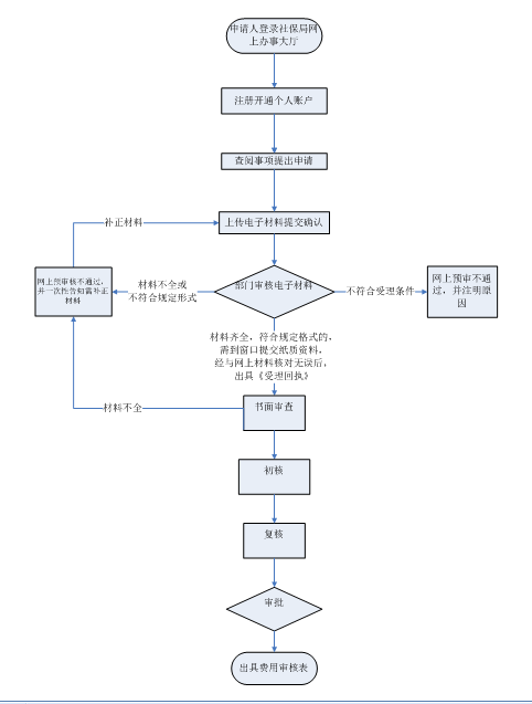 3、受理。市社保医疗保险待遇科收到网上申请后对电子材料进行预审核,符合申请资格,并材料齐全、符合规定格式的1个工作日内在网上预审核通过,不符合受理条件的,1个工作日内在网上预审核不通过,并一次性告知申请人需补正的材料。预审核通过的须到市社保医疗保险待遇科窗口提交纸质材料才予正式受理。