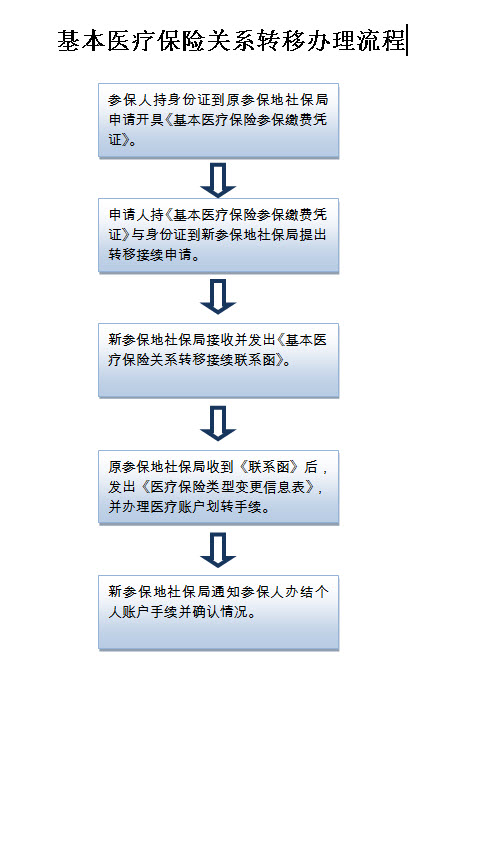 (1)基本医疗保险关系转移:原社保局申请开具《参保凭证》--新参保地社保局提出转移接续申请--新参保地社保局发出《联系函》--原社保局办理医疗关系转出并发出《参保人员医疗保险类型变更信息表》--新参保地社保局通知参保人办结;